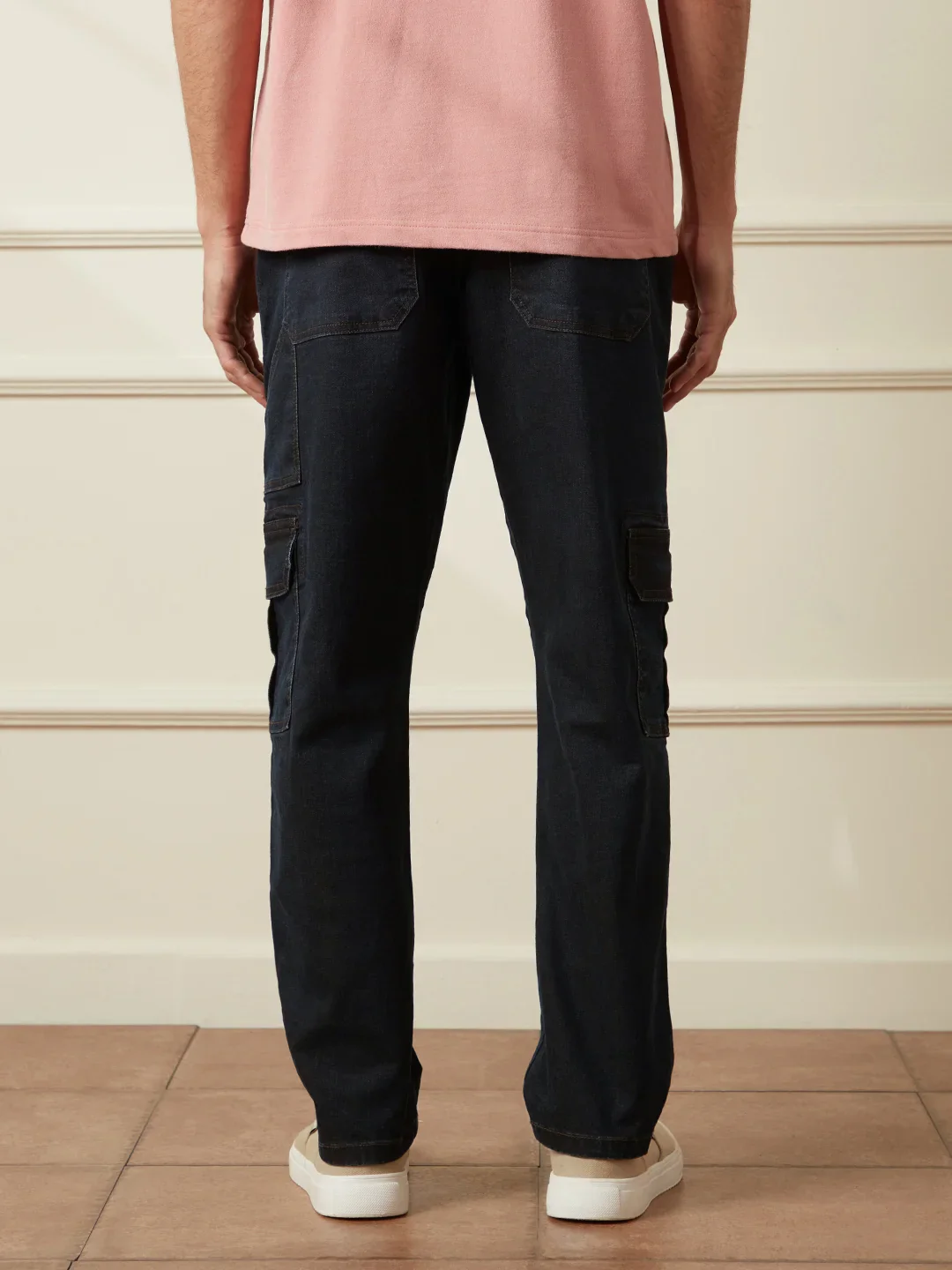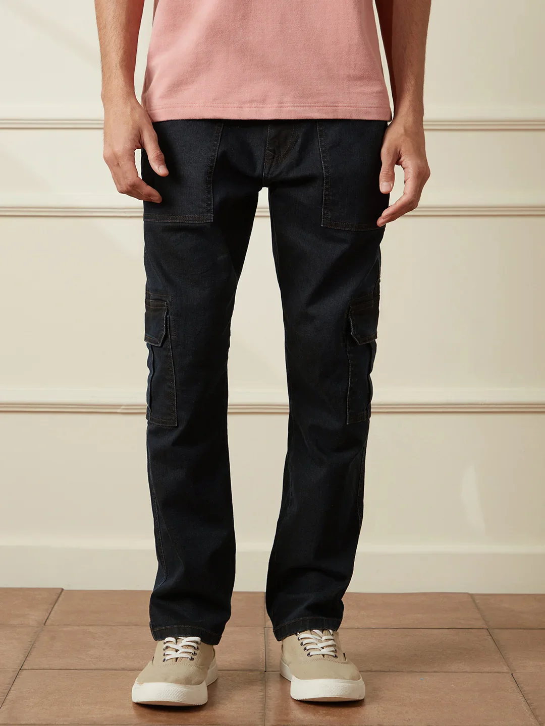 Function meets fashion with these dark blue denim cargos. Designed for men who do it All, Exclusive, these pants offer the perfect mix of utility and style.