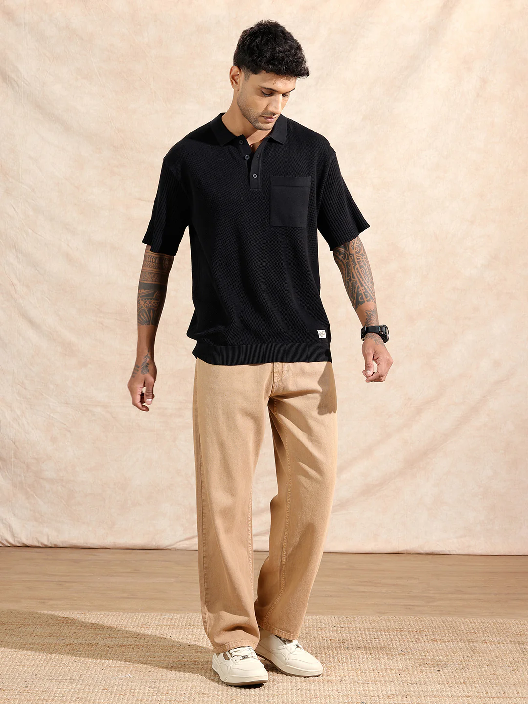 Sleek and minimal with a textured edge, this black flat knit polo is a versatile staple. The fabric has a subtle surface pattern that lifts the look without overpowering. Tailored in a slim fit to keep things sharp. Smart enough for a dinner out, casual enough for daily wear. Black never looked this interesting.